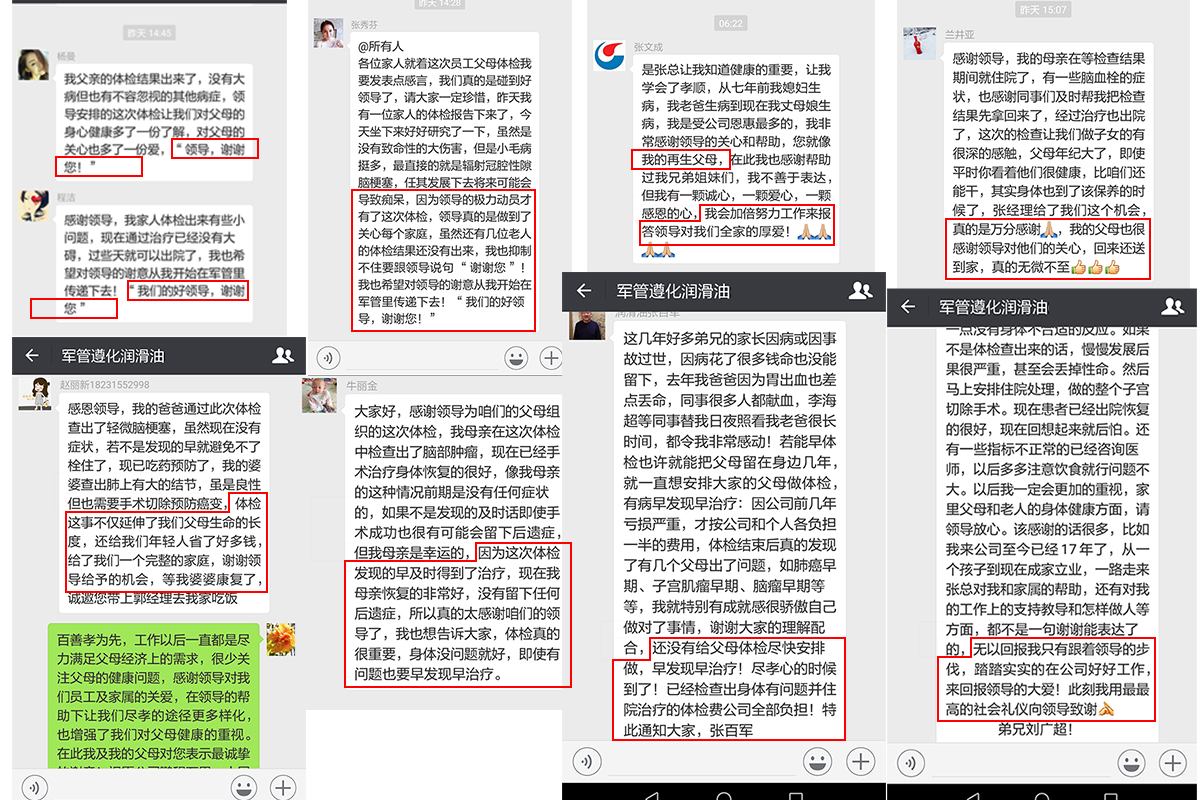 自從2018年相關(guān)數(shù)據(jù)顯示公司已經(jīng)扭轉(zhuǎn)連續(xù)多年虧損的狀態(tài),總經(jīng)理張百軍首先想到的是——公司員工的健康問題,于2018年3月組織全體員工體檢,對(duì)于體檢張百軍總經(jīng)理要求不能敷衍了事,要針對(duì)全體員工的情況,制定相應(yīng)的體檢項(xiàng)目,幾經(jīng)周折最終選定在唐山人民醫(yī)院體檢中心做體檢工作。沒有想到員工的健康問題只是張總關(guān)心的問題之一,隨后張總召開中層領(lǐng)導(dǎo)會(huì)議提出給員工父母體檢的想法,隨著時(shí)間的流逝,父母的年齡在不斷的增長(zhǎng),身體狀況也是每況愈下,但是他們對(duì)自我身體的健康意識(shí)卻非常的薄弱。于是接下來開始動(dòng)員全體員工勸說父母參加公司組織的體檢活動(dòng),又指定專人去各個(gè)醫(yī)院了解針對(duì)老年人的體檢項(xiàng)目,全體員工各司其職進(jìn)行著前期的籌備工作,于2018年8月完成了公司所有員工父母的體檢工作,所有員工父母對(duì)張總此次給予大家的福利深感謝意。其中多名員工的父母在這次體檢中受益匪淺,及時(shí)將病情扼殺在搖籃之中,為此多名員工表達(dá)了對(duì)張總的感謝。